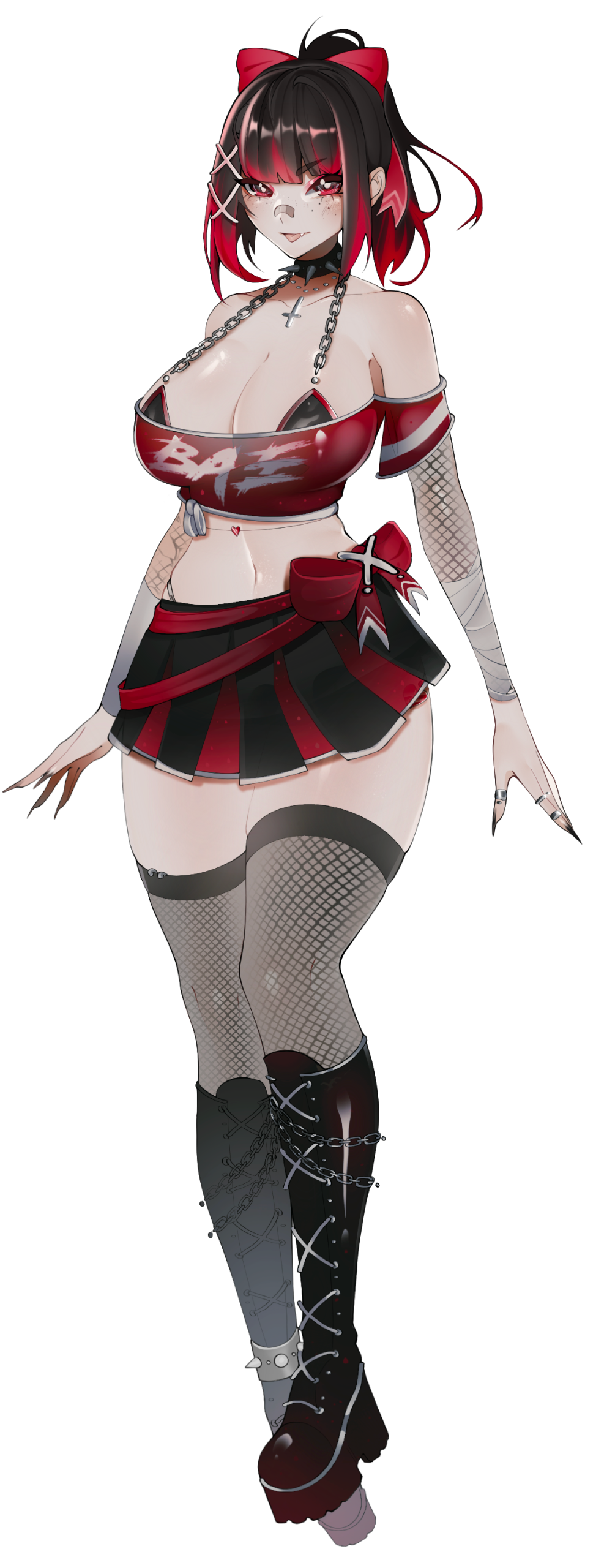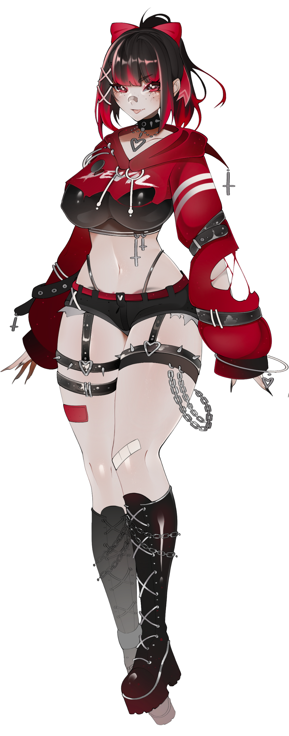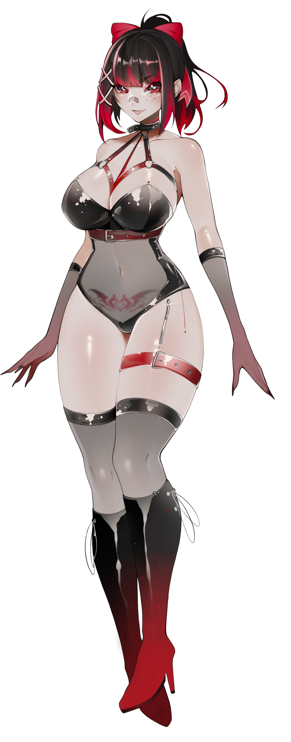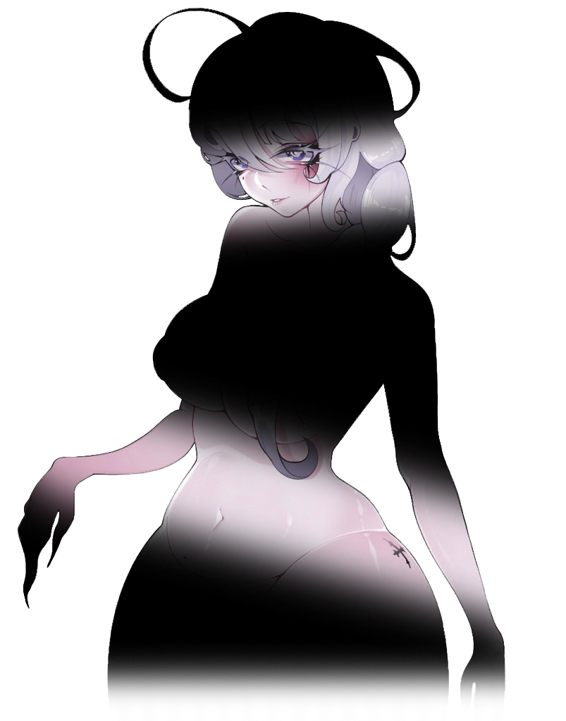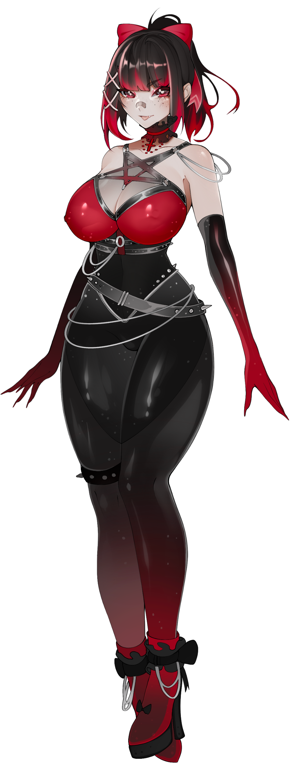 In everyday life, she dresses in a skater-punk-styled fashion, she normally ties her hair up in a high ponytail with her red ribbon and rarely lets down her hair free. With her demonic nature, she can control the length of her hair.She's a demon succubus in nature, with mystical glowing marks on her body. She hides her horns, tail, and wings in her casual state.While in her demon form, she shows off her demon wings, horns, and tail, as well as a conjured latex outfit.She loves making people around her flustered by using her "assets", but her personality backfires entirely if she gets confronted by a dominant female-presenting character to the point where her brain stops functioning, any sense of logic goes out the window, and she will always agree to do whatever the other party wants or suggests. This includes sexual situations as well as fetishes.